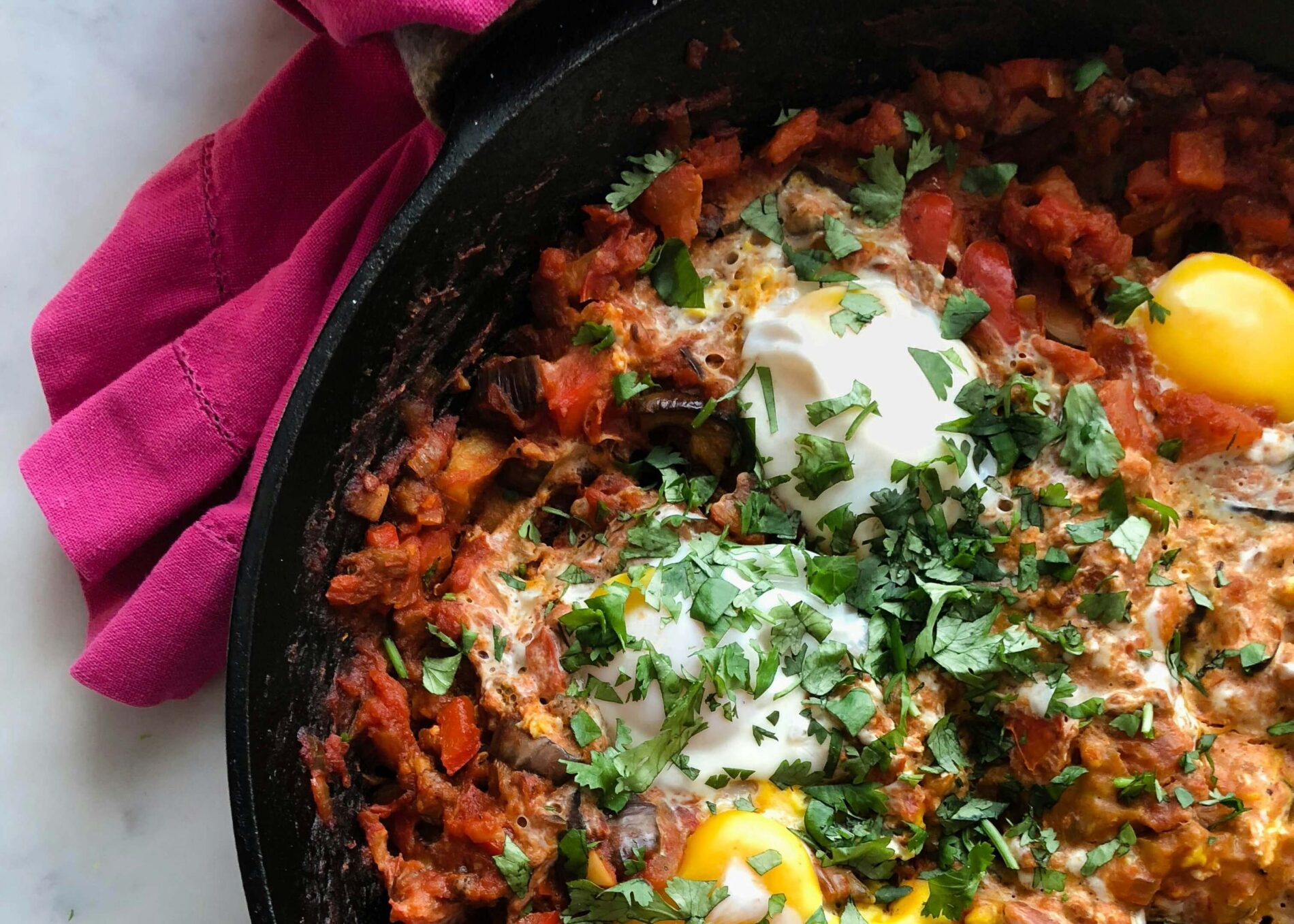 Podávejte ihned z pánve ozdobené čerstvou bazalkou, plátky avokáda, cherry rajčátky, listy salátu a jogurtem. Jako přílohu na namáčení zvolte chléb.