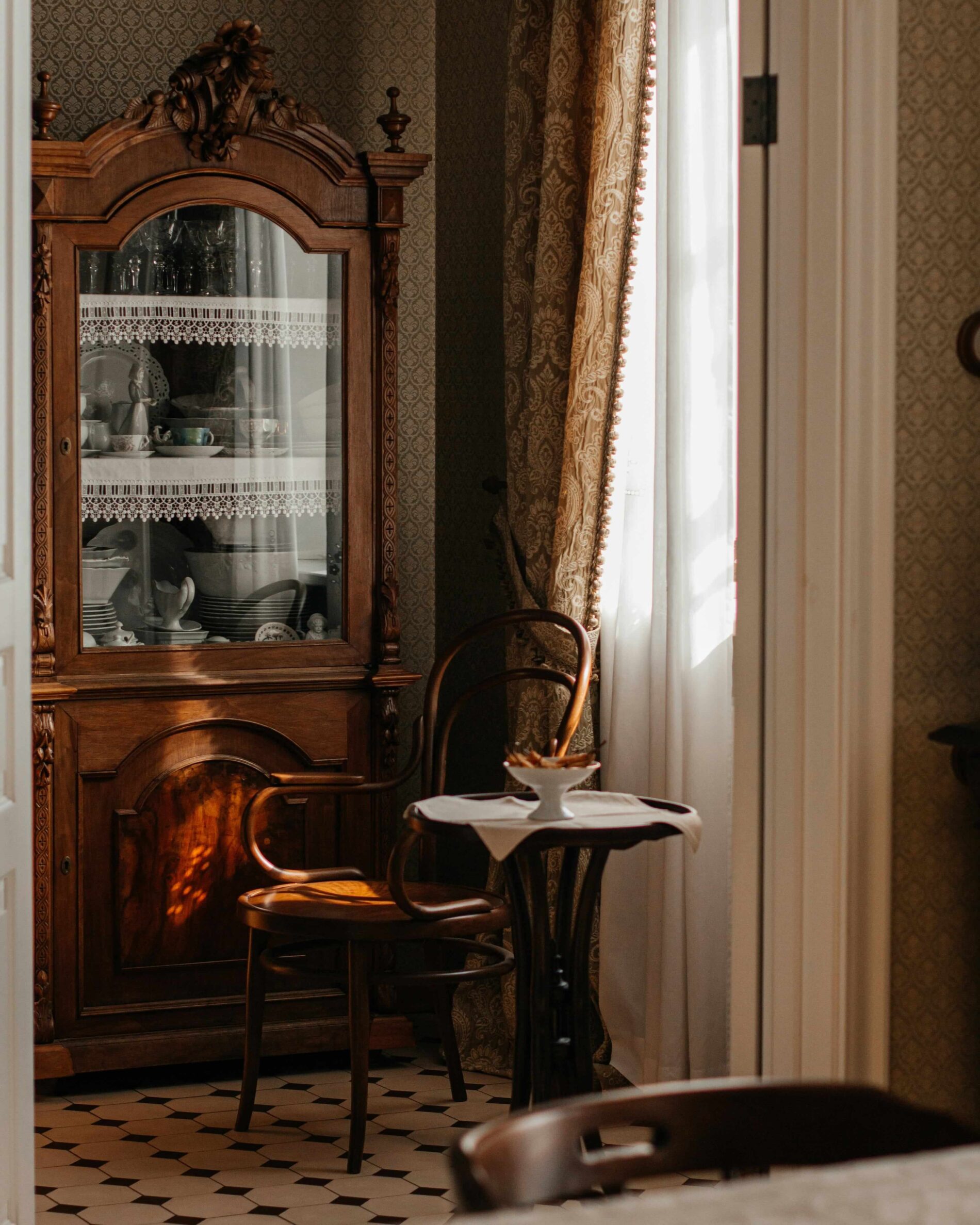 Doplňky v tomto stylu nejsou dekorací navíc, ale nositeli atmosféry. Vintage porcelán, starožitné talíře a sběratelské dekorace fungují jako vizuální akcenty i jako prvky nesoucí v sobě příběh. Tyto drobnosti prostoru dodávají hloubku a osobitost. Metalické detaily v podobě drobných stříbrných či zlatých akcentů v rámech, svítidlech nebo dekorativních objektech přinášejí jemný glamour nádech, který interiér kultivuje, aniž by působil okázale. Polštáře, deky, závěsy či koberce v přírodních tónech pak vytvářejí pocit bezpečí, měkkosti a vizuální kontinuity, díky níž prostor působí uceleně a harmonicky.