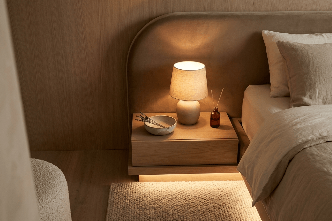 Vedle světla přichází na řadu také vůně. Moderní ložnice často pracují s aromaterapií, ale v jemné formě. Nejčastější jsou tóny levandule, cedru nebo santalového dřeva. Důležité je nepřehánět to. Ložnice nemá vonět jako parfumerie, ale jako klidný prostor.